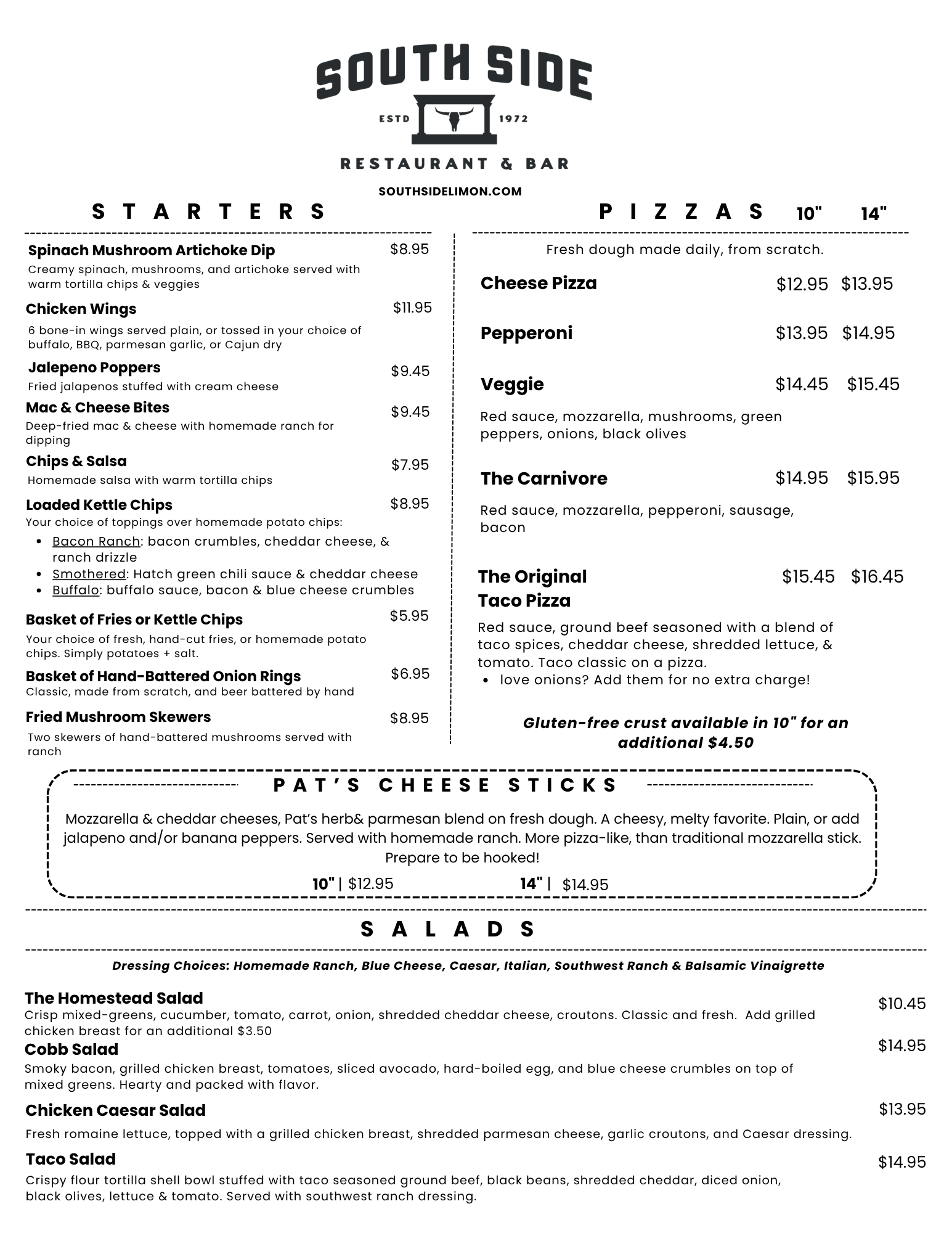 Menu: Burgers, Sandwiches, Desserts, Drinks - South Side Restaurant & Bar in Limon, CO